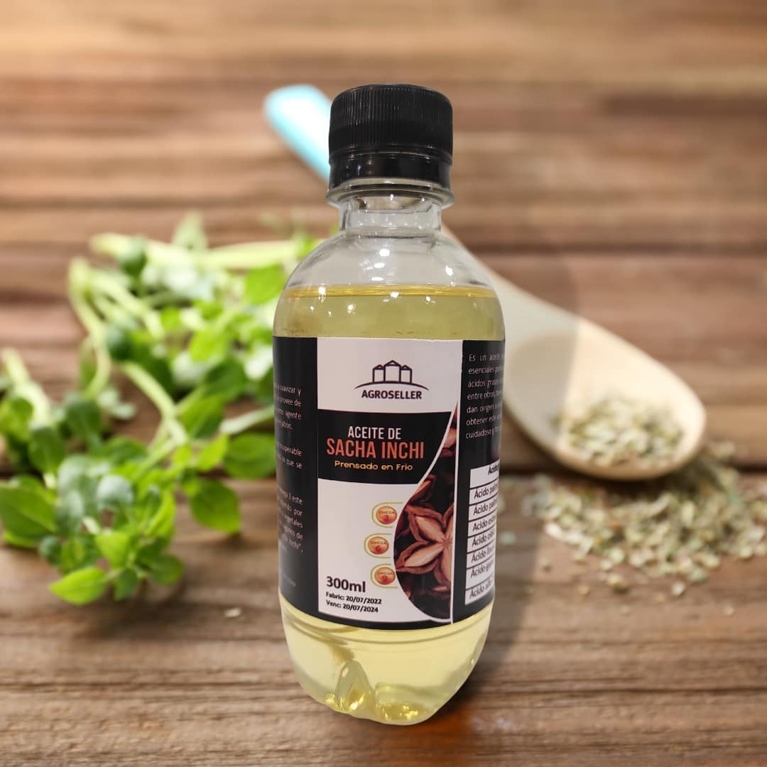 Aceite extra virgen natural de Sacha Inchi prensado en frio, para uso Cosmético y Gourmet.