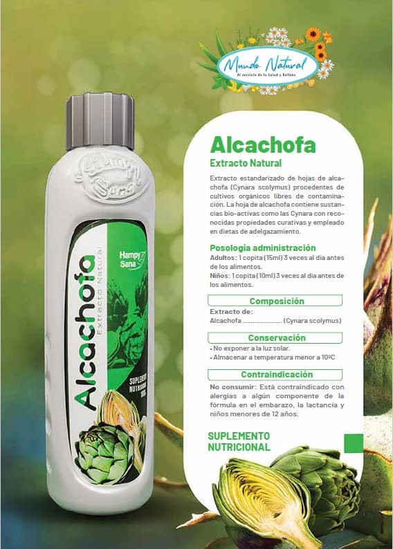 Extracto estandarizado de hojas de alcachofa (Cynara scolymus) procedentes de cultivos orgánicos libres de contaminación, con reconocidas propiedades curativas y empleado en dietas de adelgazamiento.