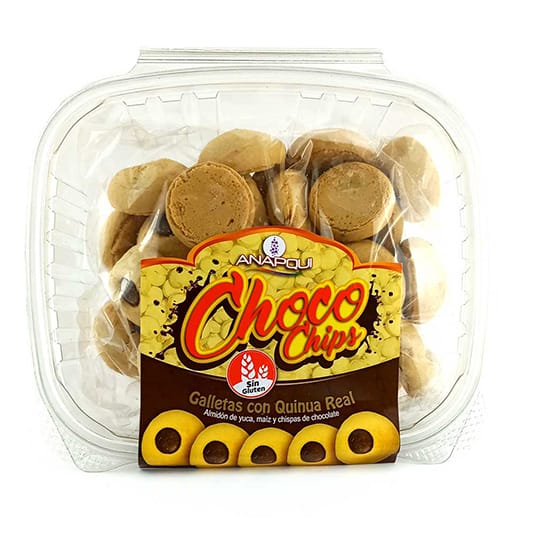 Galletas con Quinua Real, Almidón de Yuca, Maíz y Chispas de Chocolate.
