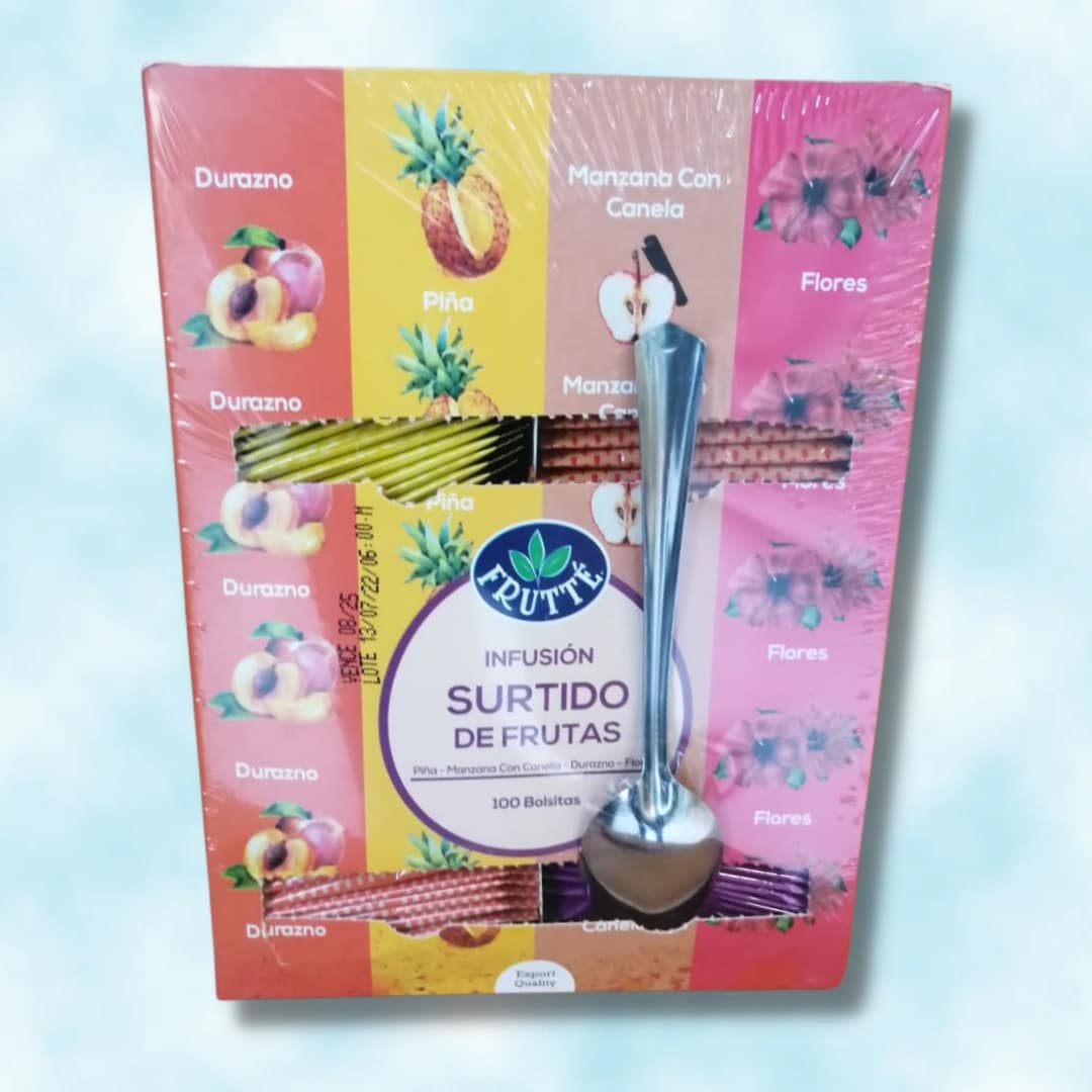 Mix de tes de frutas de manzana y canela, durazno, piña, tutti frutti y flores.